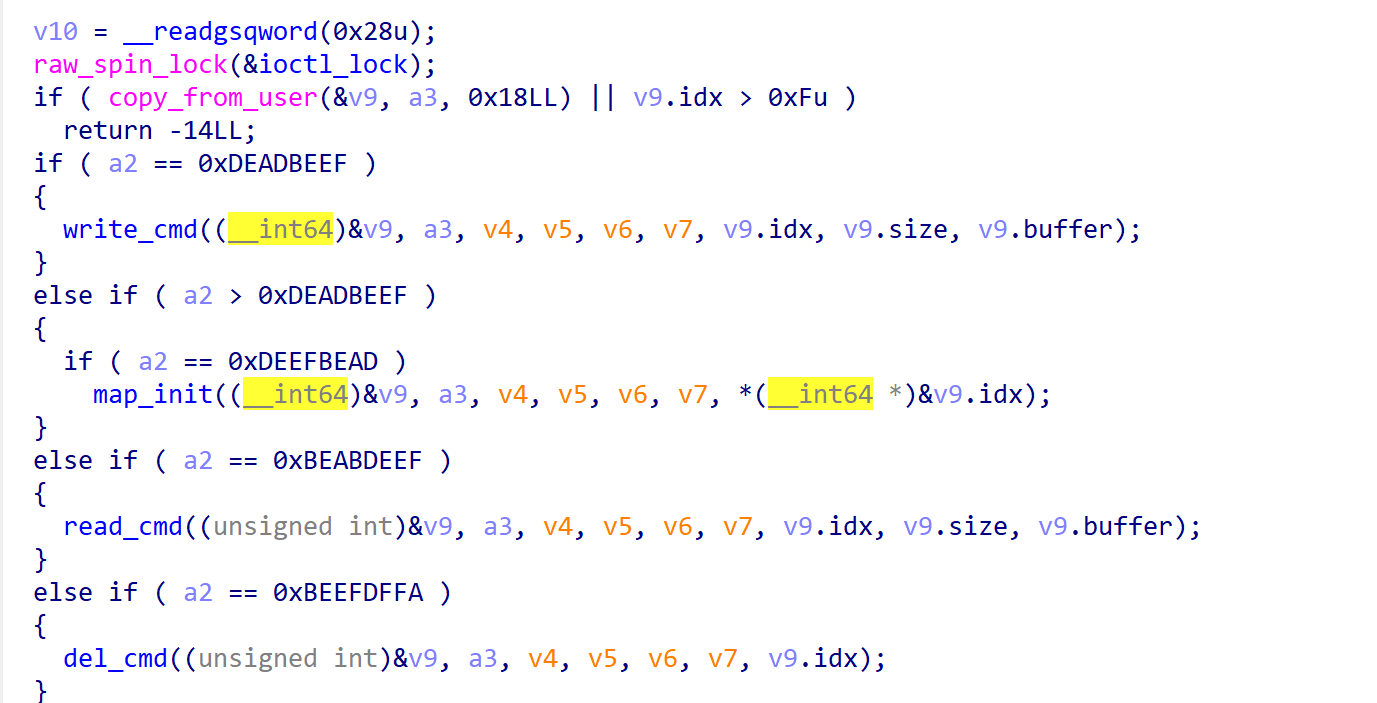 #define IOCTL_WRITE_CMD 0xdeadbeef #define IOCTL_READ_CMD 0xbeabdeef #define IOCTL_MAP_INIT 0xdeefbead #define IOCTL_MAP_DEL 0xbeefdffa