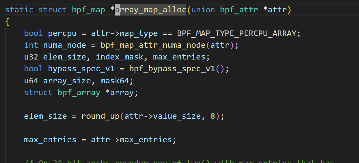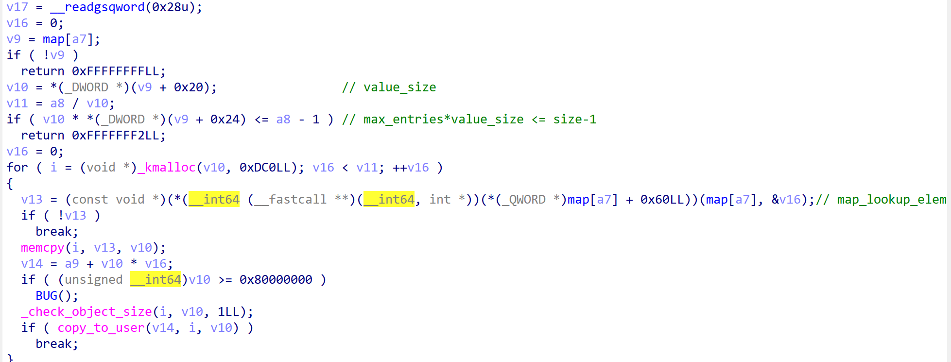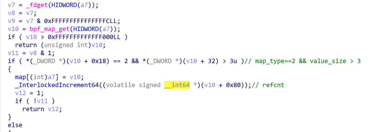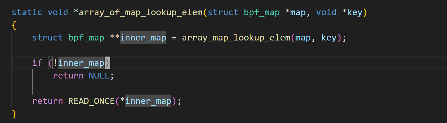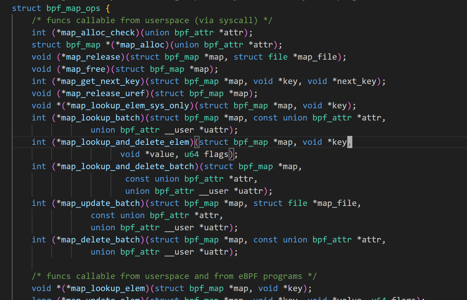 static __always_inline int bpf_map_lookup_elem(int map_fd, const void* key, void* value){ union bpf_attr attr = { .map_fd = map_fd, .key = (uint64_t)key, .value = (uint64_t)value, }; return bpf(BPF_MAP_LOOKUP_ELEM, &attr); }