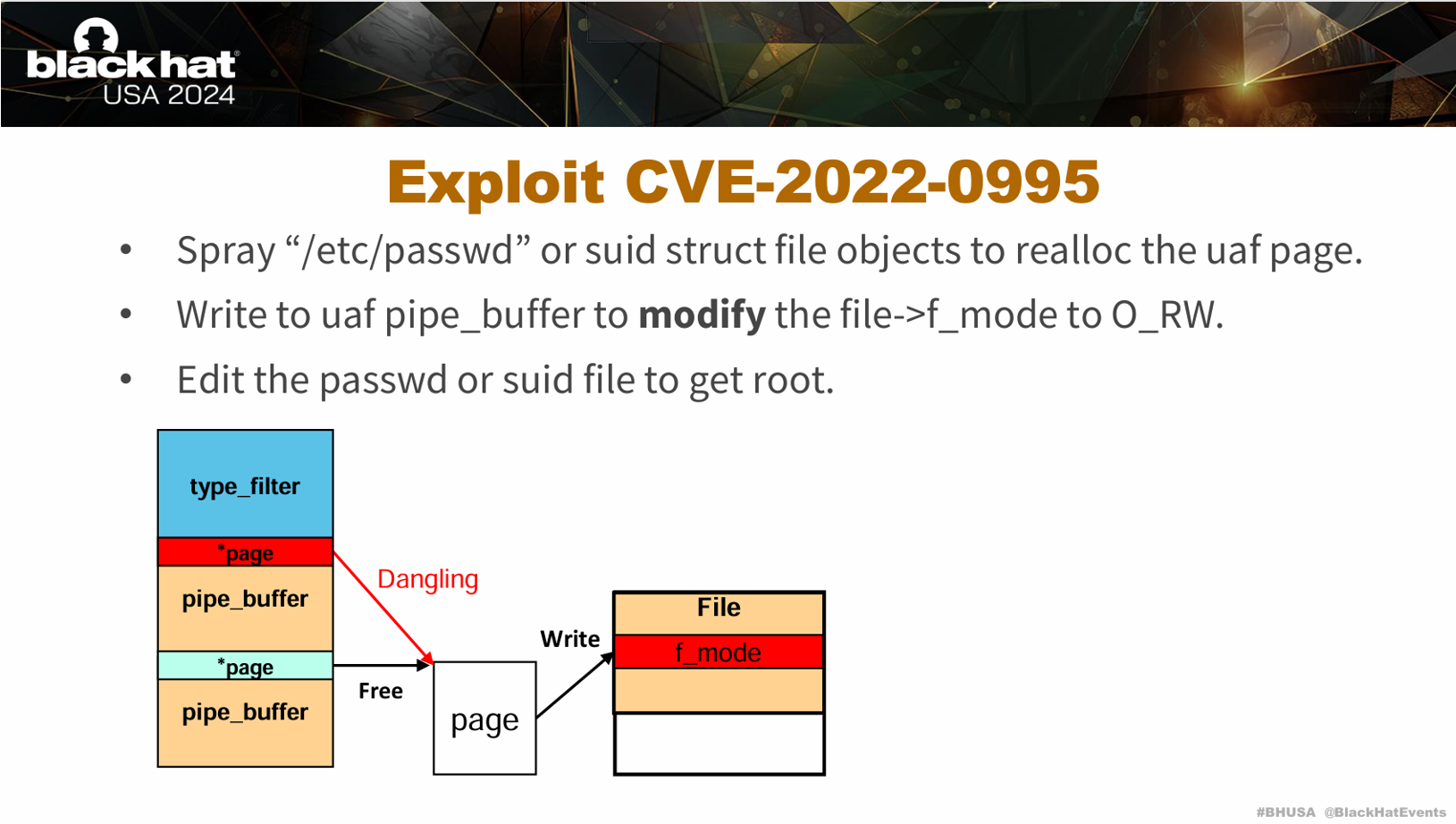 如图中 blackhat 的 ppt 就是通过 cve 修改 kernel 中的 file 结构体进而让普通用户可以越权向 passwd 文件中写入自己的数据。
