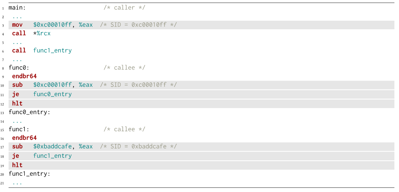 如上图所示,main 函数在 call 之前将 SID 设置为 0xc00010ff,即将 0xc00010ff 赋值给 eax 寄存器。当 call 的函数为 func0 时,通过检验发现 eax 寄存器的指为 0xc00010ff,然后跳转到 func0_entry 来继续执行 func0 函数。而如果 main 函数 call 的是 func1 函数时,由于 SID 校验不通过(func1 SID 的值为 0xbaddcafe),则会向下执行 hlt 指令来让程序停止运行。