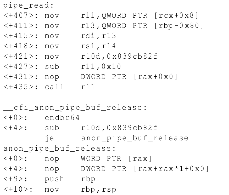 每个(其实也不是)函数都会有一个对应的 _cfi 前缀的函数,这个函数第一条指令为 endbr,然后后面接着的是 SID 校验,当校验成功时才会跳转到真正的函数入口,而真正的函数是没有 endbr 指令的,所以我们无法通过任意地址 call/jmp 原语来直接调用他。