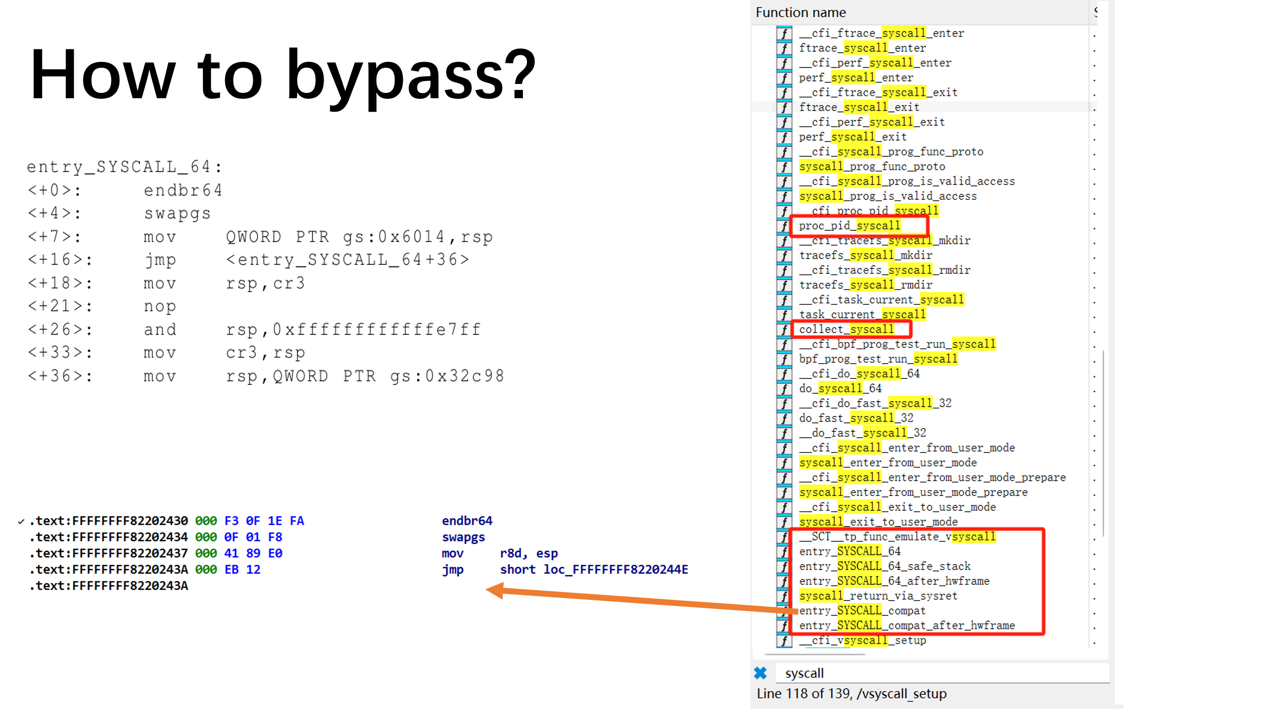 如上图所示,作者发现有许多与 syscall 入口相关的函数都有 endbr 指令但是不需要进行 SID 校验,而刚好他提出的 swapgs Stack Pivoting 用的就是这些函数,所以原理就是这么简单🤣🤣🤣