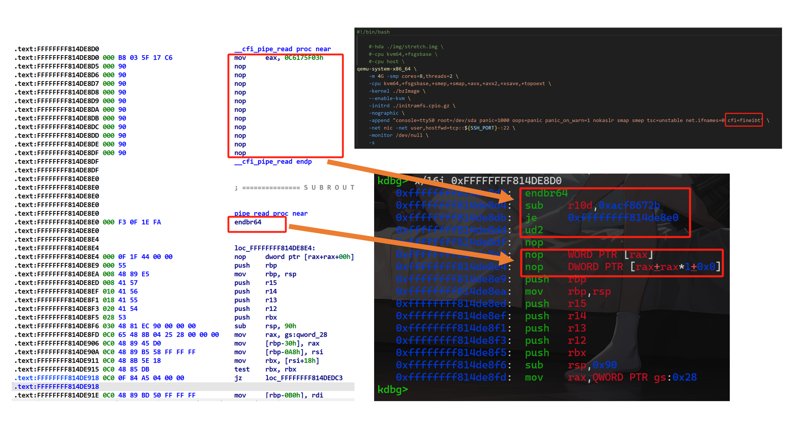 这里有个比较有趣的现象是当我们直接去 IDA 中去看这个 _cfi 函数时会发现里面全是 nop,而真正的函数入口处有 endbr,根本起不到防御的作用,而当我们在启动的时候开启了 FineIBT 选项后 kernel 在加载进内存后他会动态修改他的代码段,在 _cfi 上加上 endbr 以及一些 SID 的校验操作,然后将真正的函数入口处的 endbr 改成 nop,如下图所示: