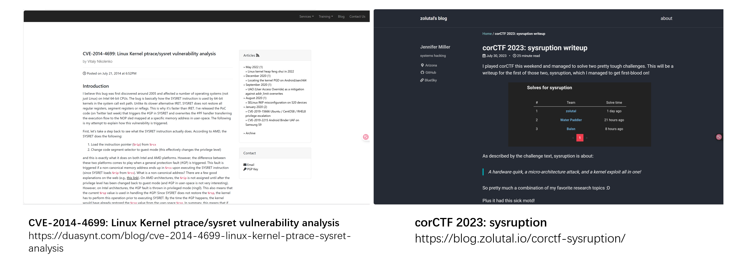 说到底,这篇论文提出的各种系统寄存器的劫持手段在非常多年前就给用所用过了。可能让人比较陌生的是对 gsbase 的劫持,可是这玩意也在 2014 年的一个 cve 上被人利用过,以及在许多高质量的 CTF 比赛中都被拿来出过题,我在下图中简单的举了几个例子,感兴趣的话可以去看看: