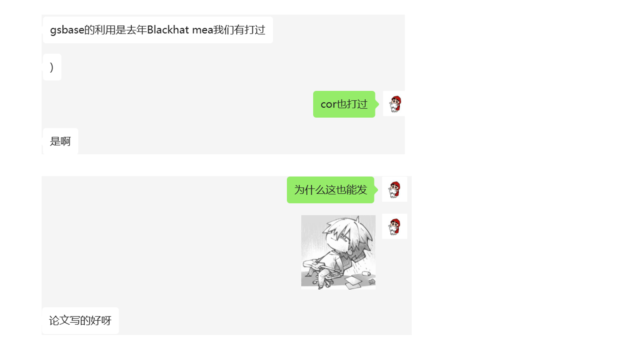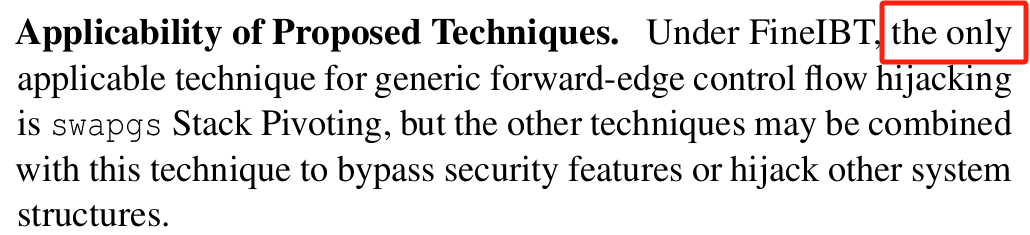 然后作者提出他的这个 swapgs Stack Pivoting 利用手法是唯一一个可以从前向边缘来绕过 FineIBT 保护机制的(我很怀疑🥲,但是汇报时没有提出来)
