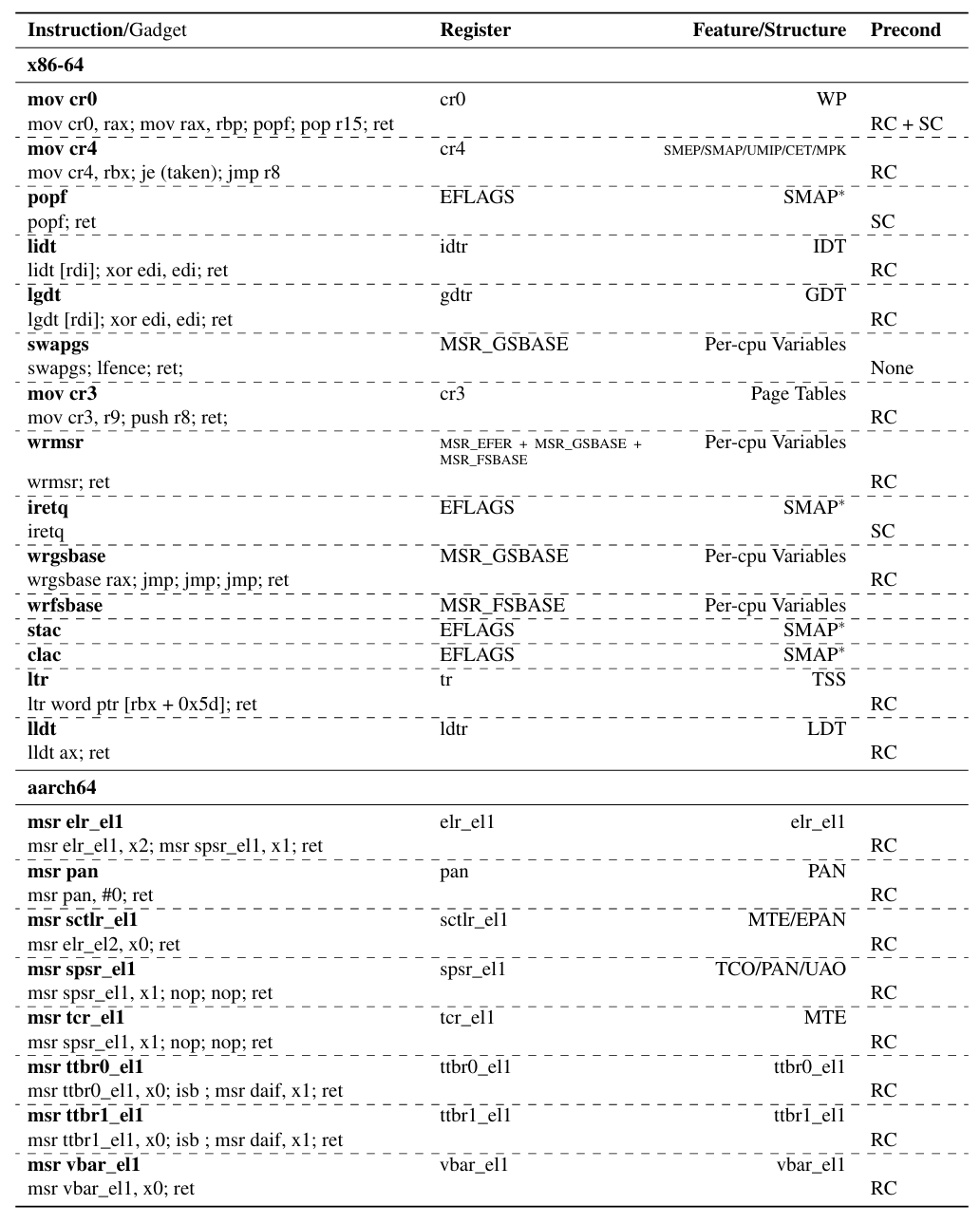 Table 1: Security-Sensitive System Register-modifying instructions identified on x86-64 and aarch64, which mitigations or structures they control, and the preconditions necessary (SC is Stack Control, RC is Register Control). Representative gadgets for each instruction where valid gadgets that are short enough to display were present are listed beneath the associated instruction. * Their iret, popf, stac, and clac instructions are able to modify the AC bit in the EFLAGS register, which controls the status of SMAP.