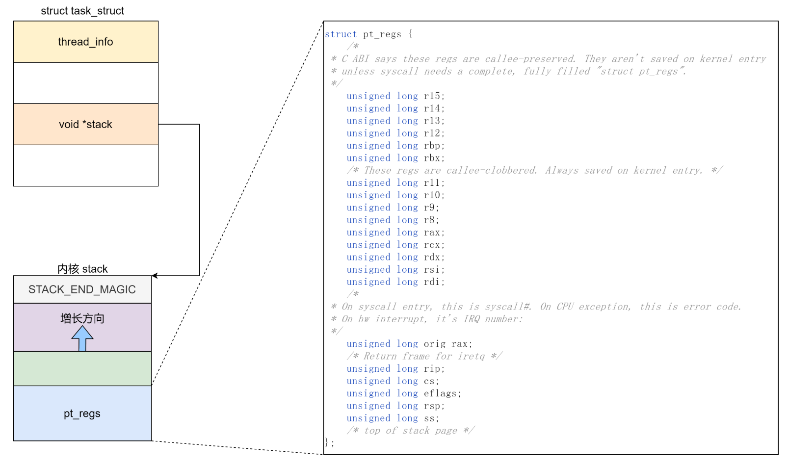 同时作者也提出可以用 popf;ret 这个 gadget 来让 rop 变得更加容易。当用户态切换到内核态时,os 会将用户态的寄存器保存在 kernel 的栈上,这个结构被叫做 pt_regs,这个结构在早期的 kernel 版本中在栈中的偏移是固定的