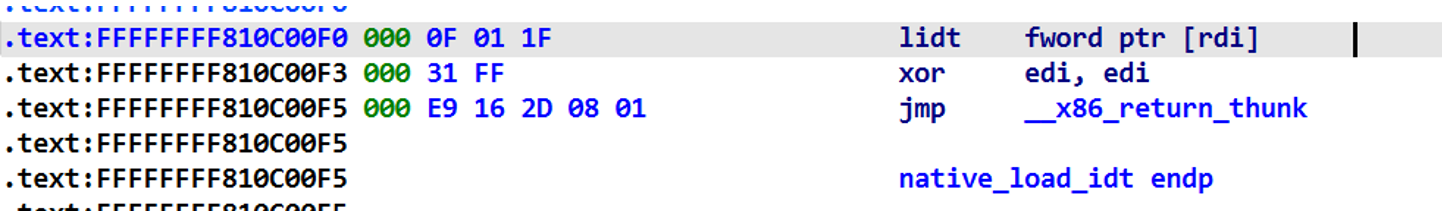 早期对 linux kernel 中断向量的攻击是直接去修改中断向量的指针,而现在的 linux kernel 已经将这块区域设置为只读。作者发现 kernel 中存在一个叫 lidt 的 gadget 可以直接修改 IDTR.base 到一块攻击者可用的内存上,进而让每次中断/异常的“门描述符”都由攻击者提供,变相的让攻击者的获得任意地址 call 的利用原语。