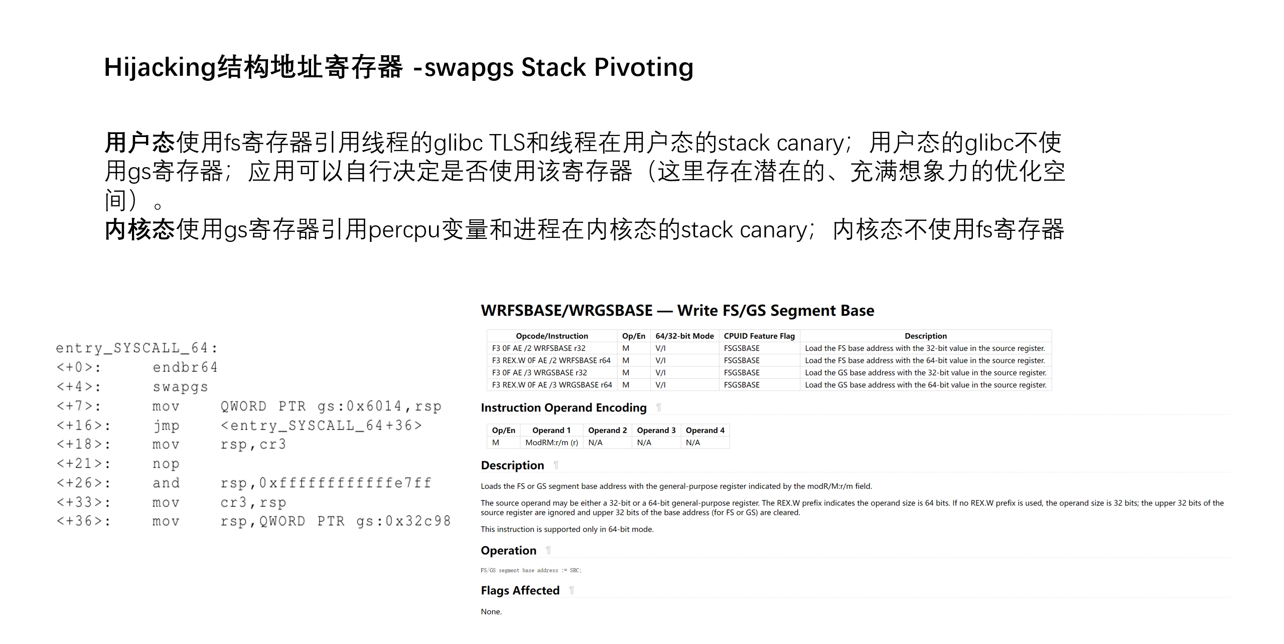 然后这是这篇论文最精彩的部分,就是通过劫持 gsbase 来进行栈迁移。linux 中存在两个 gsbase 分别指向两个 gs 结构,一个在用户态,一个在内核态。在新版本的 linux kernel 中支持 wrgsbase 指令让用户可以设置用户态的 gsbase。gs 结构里面存放着 rsp 等重要信息。当用户态通过系统调用 syscall 进入到内核时,会先调用 swapgs 来进行用户态和内核态的 gsbase 的交换,然后从内核 gsbase 中取出内核栈的地址赋值给 rsp 寄存器。作者提出如果我们能够合理利用这个特性,就能够实现栈迁移。