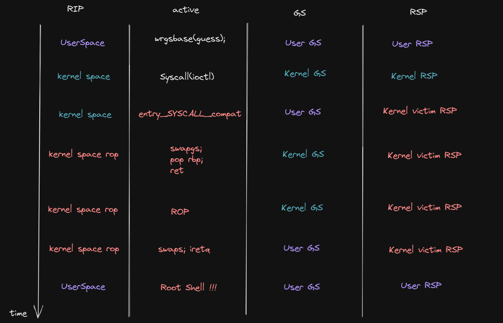 首先用户在一块可控的内核空间上伪造一个恶意的 gs 结构,并且将里面存放的栈地址指向恶意的即后面 rop 链的地址,然后使用 wrgsbase 指令将用户态的 gsbase 指向我们在 kernel 中伪造的 gs 结构