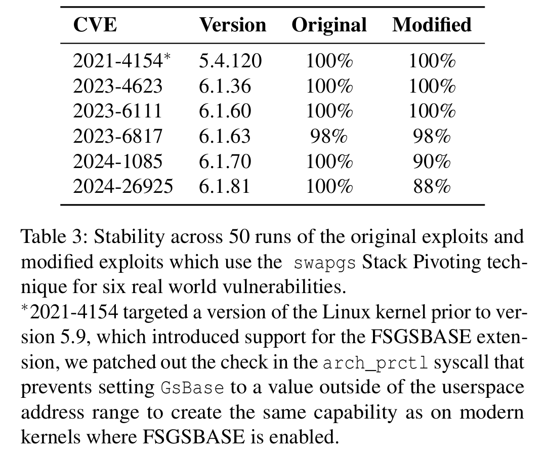 作者直接拿原有的几个 cve 的 exp 进行修改,将最后劫持程序流利用那部分修改成他提出的 swapgs Stack Pivoting 方法进行对比成功率,发现大部分的情况成功率都不变,少部分情况成功率出现了小幅度的降低,可见这种利用方法是可行的,至于实用性,他好像没有说🤣