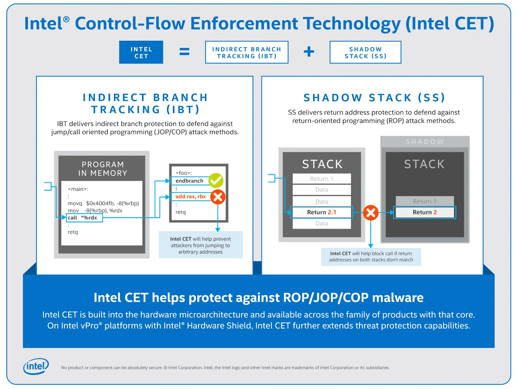 CET 机制是 Intel 提出的⽤于缓解 ROP/JOP/COP 的新技术。基于硬件⽀持的解决⽅案,旨在预防前向( call/jmp )和后向( ret )控制流指令劫持。
