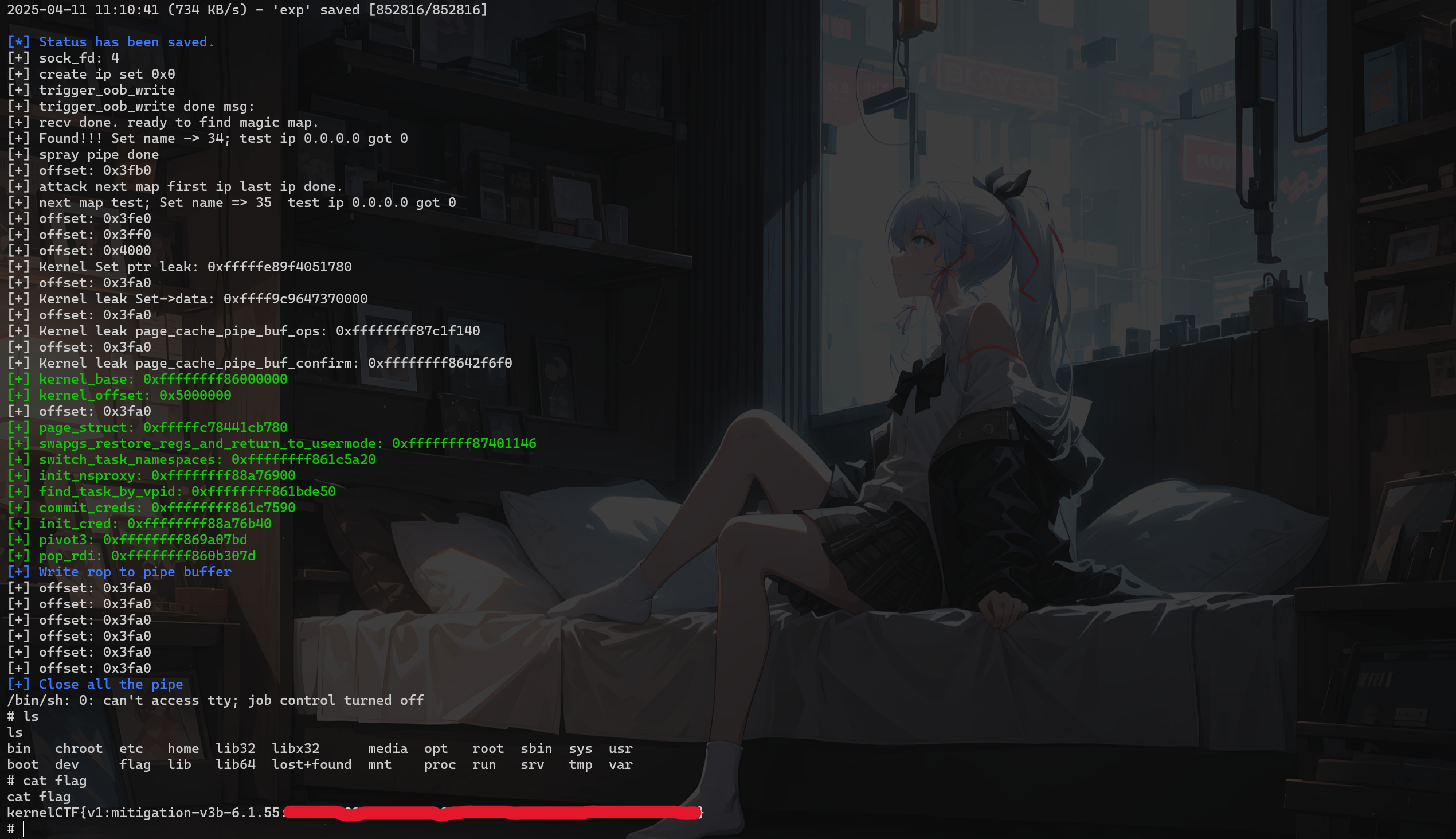上课摸鱼发现 KernelCTF 有 1day 没有 fix,与 C 某和 V 某奋战了五天,绕过了 CONFIG_SLAB_VIRTUAL、CONFIG_KMALLOC_SPLIT_VARSIZE、CONFIG_RANDOM_KMALLOC_CACHES 以及 Google 自己加的一堆实验保护,成功提权和 chroot 逃逸,也是第一次看见了 KernelCTF 的 flag