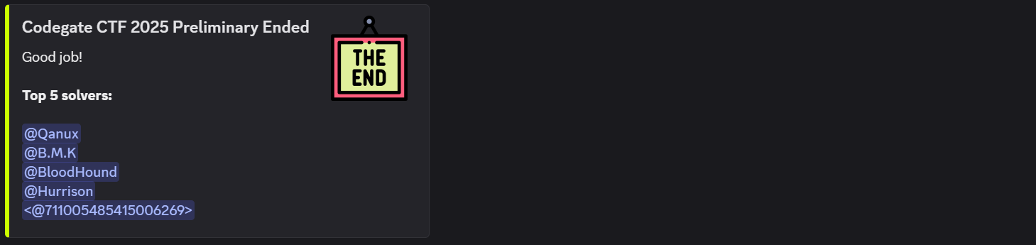 XCTF Final 第一天是打解题赛,线上没什么人看题,打的一坨屎。当天晚上非常难受,想到第二天周一打 AwD 线上直接会没有支援,压力真的拉满了。第二天 AwD 背水一战,开局 5 分钟我直接打通 pwn 开始打全场,后面我也成功又打了 2 次全场,以一己之力打了最后的冠军 0ops 好几万分。队友们也非常给力,框框输出,最后拿下 AwD 全场第二名!!!圆梦了😭😭😭